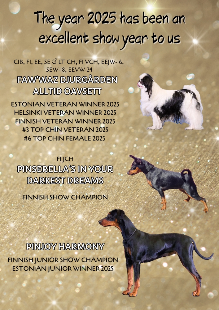 Ensimmäinen japanese chin tuli meille vuonna 1995. Siitä alkoi matka rodun parissa ja se jatkuu katkeamatta edelleen. Ensimmäinen kääpiöpinseri tuli 2001 ja pinseri 2007. Nykyään lauman muodostavat chinit Hippu ja Myytti sekä kääpiöpinseri Fira ja pinseri Ria.